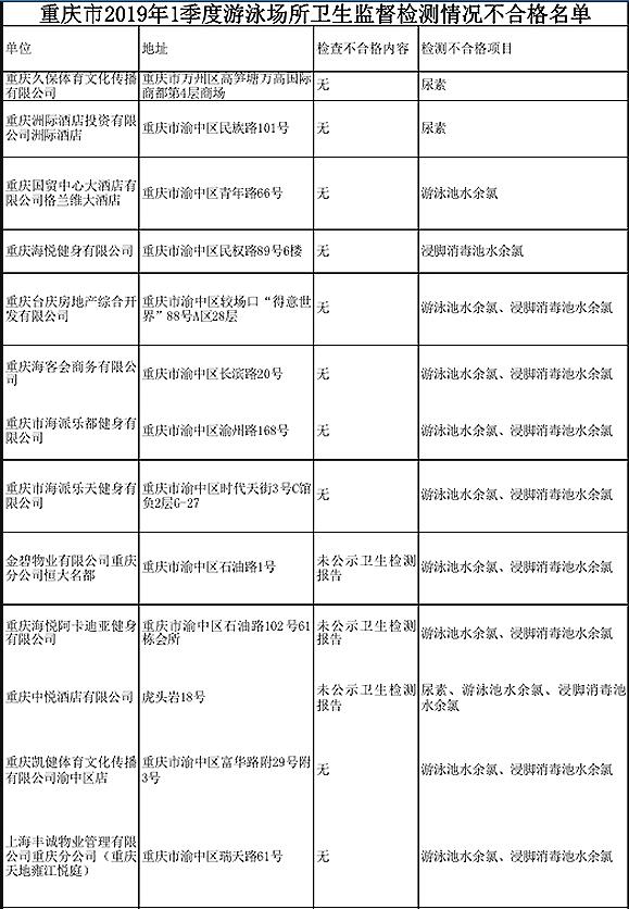近日,重慶市衛(wèi)生健康委通報(bào)了2019年第一季度常年開放游泳場所衛(wèi)生監(jiān)督檢測情況,在170個(gè)常年開放游泳場所中,有45個(gè)不合格,占比近三成。檢查中檢測出不少不合格項(xiàng)目,比如游泳池水有尿素、余氯超標(biāo),細(xì)菌總數(shù)超標(biāo)、有大腸菌群等。在不合格的游泳場所名單中,包括海派健身、洲際酒店等單位的游泳場所。