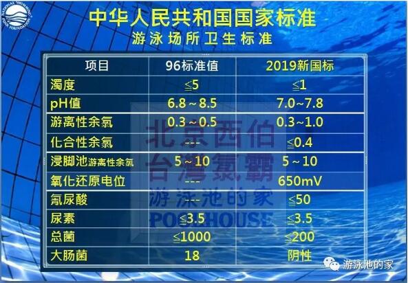 其實(shí)從1996年開始,我國就已經(jīng)發(fā)行了《游泳場所衛(wèi)生標(biāo)準(zhǔn)GB9667─1996》在之后的幾年里一直在不斷修訂,直到今年,又重新發(fā)布了“2019新國標(biāo)”。標(biāo)準(zhǔn)中對于泳池水的各項(xiàng)檢測指標(biāo)的標(biāo)準(zhǔn)要求有了新的修訂,更有利于保證泳客們的身體健康。