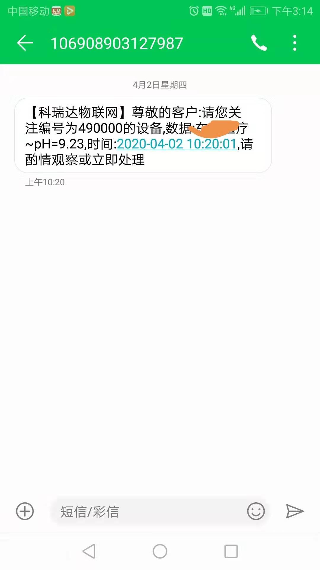 科瑞達多參數在線分析儀實時在線監測的參數數值可以連接科瑞達水質監測管控平臺客戶端,如果pH、電導率、濁度、余氯等參數值一項或某幾項超標后,監控平臺會發出警告,并通過短信的方式發送到客戶或運維人員的手機上,提醒其做出及時處理。