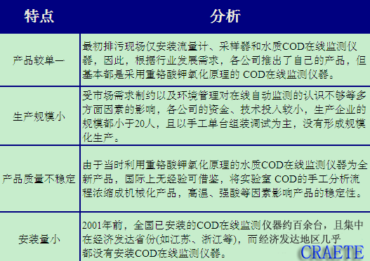 經過十多年的發展,我國的水質在線監測系統已經從作坊形式發展成為監測專用儀器的支柱產業之一。發展之初,我國水質監測產品單一,生產規模小,且安裝量很小,根據前瞻產業研究院發布的《2015-2020年中國水質監測行業發展前景與投資機會分析報告》,2001年前,全國已安裝的COD在線監測儀器約百余臺,且集中在經濟發達省份(如江蘇、浙江等),而經濟欠發達地區,幾乎都沒有安裝COD在線監測儀器。 圖表1:我國水質在線監測市場發展初級階段特點分析