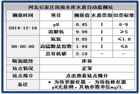 河北石家莊崗南水庫水質自動監測站位于石家莊市平山縣崗南鎮。點位坐標東經113度59分34秒,北緯38度19分06秒。海河流域,崗南水庫(庫體),國控省界斷面。由石家莊市環境監測站托管。距水站70多公里。建于2001年4月。